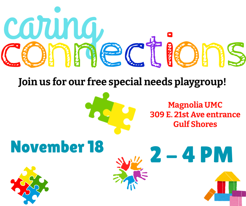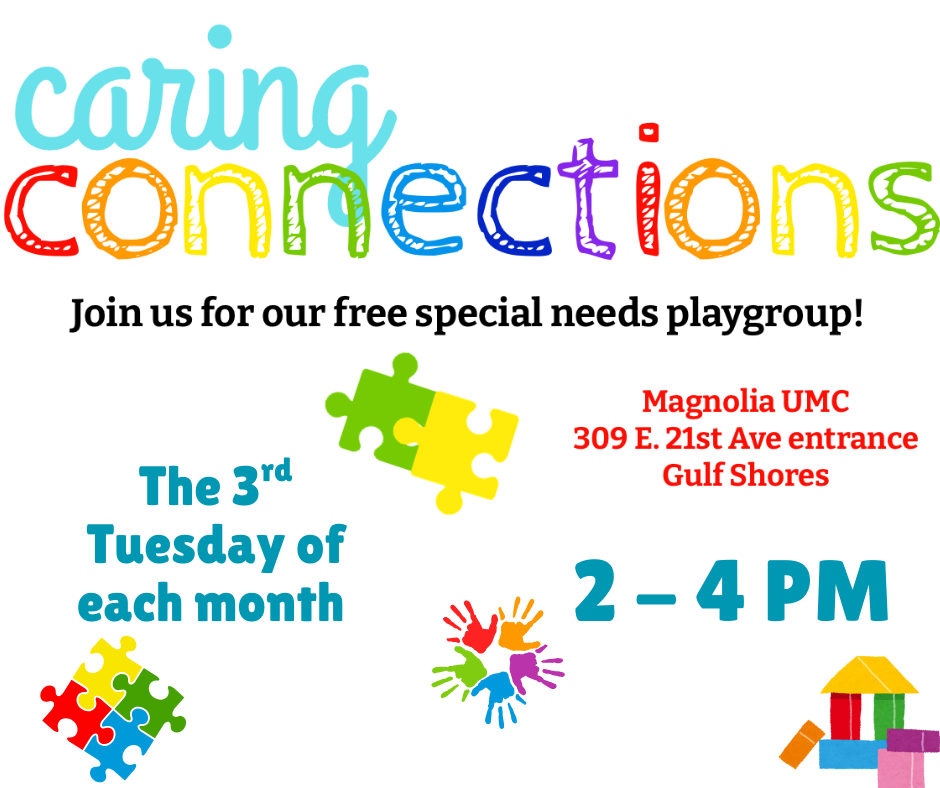 Caring Connections is a ministry outreach at Magnolia UMC. This ministry meets once a month. This inclusive play group is designed specifically for special needs children and their caregivers. Each month, families are invited to join us for a fun-filled afternoon of open play, music time, and engaging crafts.